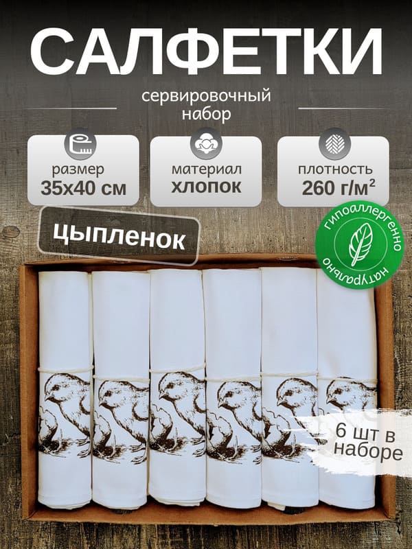 Набор сервировочных салфеток «Первый взгляд»Когда на столе появляются красивые салфетки на стол, атмосфера за ужином меняется незаметно, но ощутимо. Набор из шести хлопковых салфеток с трогательным рисунком - коричневый цыплёнок, который только вылупился и с любопытством смотрит на своё яйцо - создаёт то самое ощущение домашнего тепла, которое так хочется подарить близким. Каждая салфетка сервировочная на стол выполнена из натурального отбеленного хлопка плотностью 260 гр/м², что обеспечивает приятную тяжесть ткани, отличную впитываемость и долговечность даже при частых стирках.