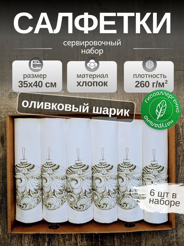 "Оливковый шик: набор сервировочных салфеток для особенных праздников"Когда приходит время подготовки к зимним праздникам, каждая хозяйка стремится создать неповторимую атмосферу уюта и тепла в доме. Представляем вашему вниманию эксклюзивный "Оливковый шик" – набор из роскошных хлопковых салфеток на стол, которые станут настоящим украшением праздничного застолья.