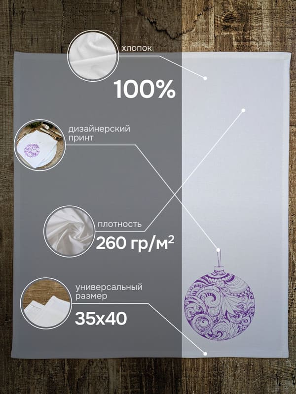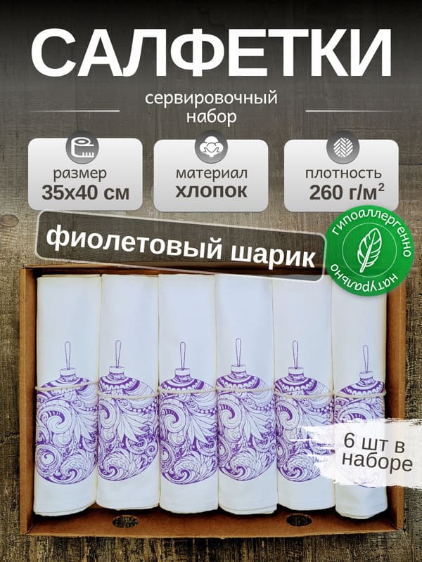 Название набора: «Фиолетовый шар удачи»Представьте себе: за окном мороз, на улице — сказка, а у вас дома уже пахнет корицей, мандаринами и теплом. На столе — сверкающая новогодняя елка, а рядом — сервировка, в которой каждая деталь говорит о заботе и вкусе. Именно в такие моменты особенно хочется, чтобы даже мелочи — вроде салфеток на стол под тарелки — были не просто функциональными, а по-настоящему красивыми.
