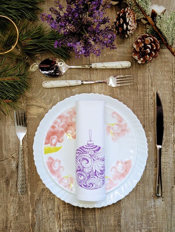 Главный акцент — эксклюзивный однотонный рисунок: фиолетовый новогодний шар. Не кричащий, не перегруженный узорами, а сдержанный, элегантный, словно намекающий на тайну праздника. Фиолетовый — цвет интуиции, вдохновения и благородства. Он идеально впишется и в классическую сервировку, и в современную, добавив изюминку без излишеств.