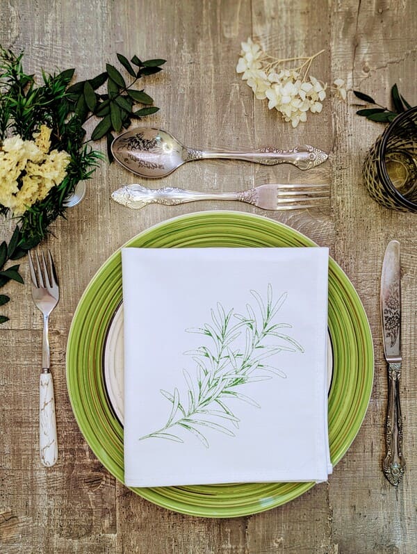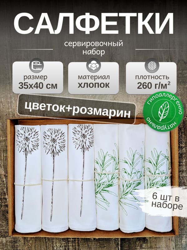Дизайн салфеток поражает своей эксклюзивностью. В наборе представлены два уникальных принта: черный цветок и зеленый розмарин. Эти мотивы сочетают в себе элегантность и природную красоту, что делает их универсальными для любого случая. Будь то романтический ужин, семейное торжество или праздничный банкет, эти красивые салфетки на стол станут ярким акцентом вашей сервировки.