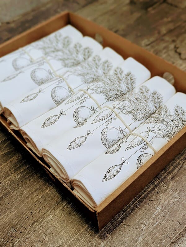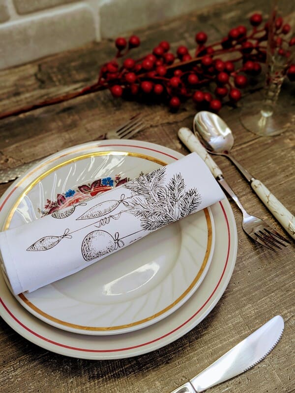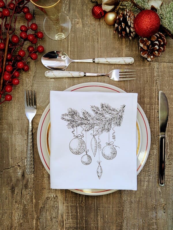 Но настоящая душа набора — в его эксклюзивном рисунке. Ветка ели с аккуратно развешенными игрушками. Узор выполнен в однотонном черном цвете, что является гениальным решением. Это не кричащая яркость, а утонченная графика, напоминающая изящную гравюру. Такой дизайн делает салфетки невероятно стильными и универсальными. Они идеально сочетаются и с традиционной красно-зеленой палитрой праздника, и с современным трендом на бело-золотые, серебряные или синие решения. Рисунок нанесен вручную, а это значит, что каждая салфетка сервировочная на стол обладает своей собственной, едва уловимой аурой ручной работы, неся в себе тепло человеческих рук.