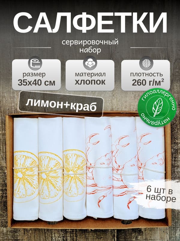 Не откладывайте красоту на завтра! Купить салфетки хлопковые «Цитрусовый прибой» — значит вложиться в сотни моментов радости для себя или близких. Ведь иногда именно такие мелочи — алый краб на фоне солнечного лимона — делают жизнь ярче.