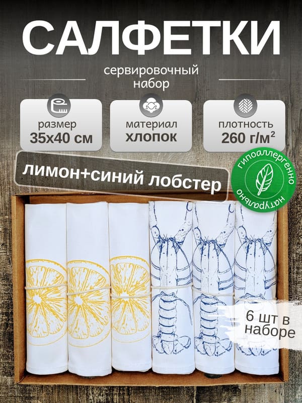 Набор сервировочных салфеток "Солнечное побережье": яркие акценты для вашего столаПревратите обычную трапезу в кулинарный праздник с этим потрясающим набором из 6 тканевых салфеток. Каждая салфетка сервировочная на стол в этом комплекте - это маленькое произведение искусства, сочетающее в себе солнечную энергию желтых лимонов и средиземноморский шарм синих лобстеров.