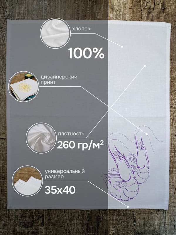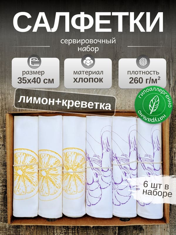 - Для себя Если вы цените красоту и функциональность, купить салфетки на стол из натурального хлопка — это отличный выбор. Они помогут создать уютную атмосферу за обеденным столом и станут вашими верными помощниками в ежедневной сервировке. Желтый лимон и фиолетовая креветка добавят свежести и оригинальности, сделав даже обычный завтрак особенным.