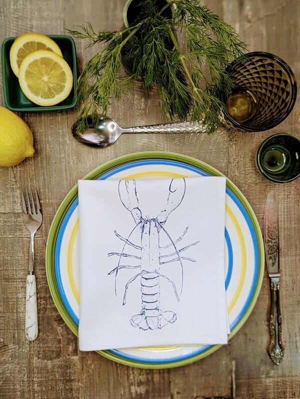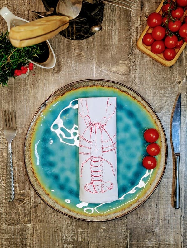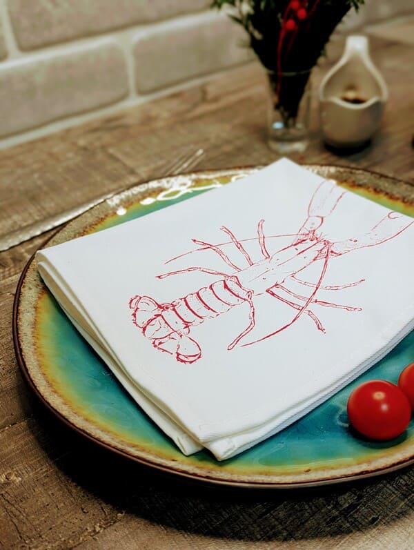 - Уникальный дизайн: чередование однотонных салфеток с тематическими рисунками (лобстеры) добавляет нотку роскоши и подходит как для повседневной сервировки, так и для праздников.