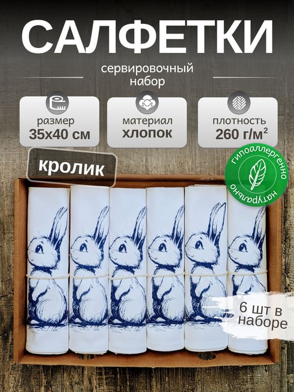 Выбирая красивые салфетки, обратите внимание на этот набор. Он точно не оставит равнодушным никого, кто ценит красоту и уют. Ведь в мире, полном суеты, так важны маленькие тёплые детали, которые делают нас счастливее. А пасхальный кролик, будто нарисованный синей ручкой, будет напоминать о весне и чудесах каждый день.