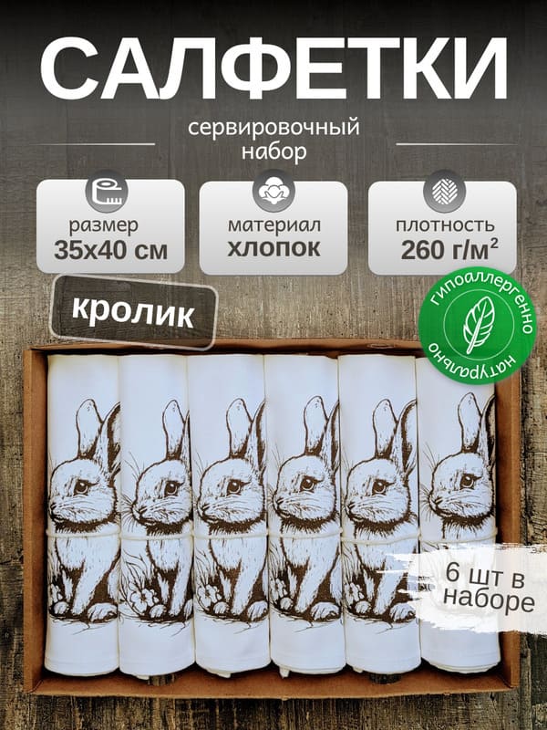 Красивые салфетки на стол из 100% натурального хлопка плотностью 260 гр/м2 - это инвестиция в уют вашего дома. Такой материал отлично впитывает влагу, не теряет форму и не выцветает со временем. А эксклюзивный принт с однотонным коричневым кроликом в цветах делает каждую салфетку сервировочную на стол уникальной - вы не найдёте такого рисунка в масс-маркете. Если вы давно хотели купить салфетки на стол, которые будут радовать глаз и служить верой и правдой, этот набор - именно то, что нужно.