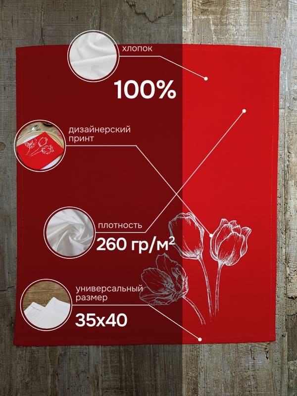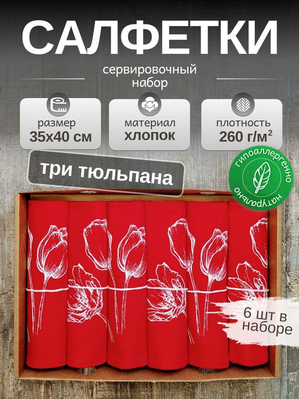 В основу легла ткань саржа из натурального 100% хлопка плотностью 260 гр/м². Это выбор в пользу безупречной практичности: материал прочен, долговечен, приятно тяжел и великолепно держит форму. При производстве продукции "Смоленский лён" используется белорусский лен (Оршанский льнокомбинат), костромской лен (Костромская льняная мануфактура), хлопок. Размер 35*40 см делает каждую салфетку сервировочную на стол идеальным фоном для тарелки или самостоятельным украшением края столешницы. Но душу набора составляет его цвет и рисунок. Глубокий, страстный, почти алый красный фон выступает как символ энергии, праздника и тепла. На этом насыщенном полотне играюще светятся три белоснежных тюльпана — эксклюзивный рисунок, выполненный с тонкой графической точностью. Этот союз — алого и белого — создает невероятно эффектный, праздничный и одновременно элегантный образ. Такие красивые салфетки на стол мгновенно приковывают взгляд.