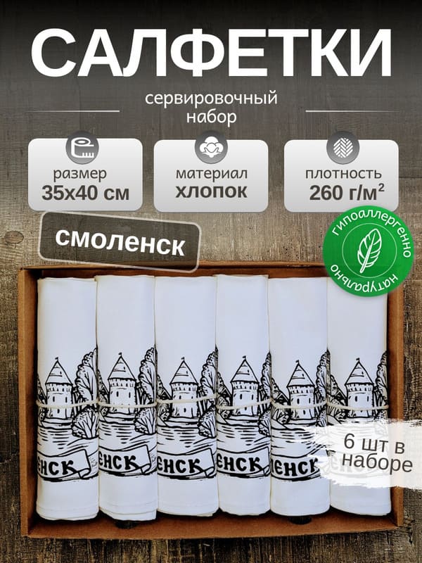 «Смоленские Вечера» — набор сервировочных салфеток, где история встречается с уютомЕсли вы когда-нибудь стояли на берегу Днепра в Смоленске, чувствовали прохладный ветер, слышали шелест листьев над древними стенами кремля — вы поймёте, почему этот набор салфеток на стол не просто текстиль, а маленький кусочек души города. Каждая салфетка — как отдельная страница из старинного альбома: белоснежная, плотная, с чётким черным рисунком, будто вырезанным пером художника, который знал каждый камень и каждую башню.