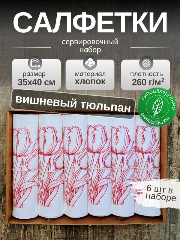 «Вишневые тюльпаны»: элегантность в каждой деталиИдеально сервированный стол — это не только вкусные блюда, но и атмосфера. Та самая, которую создают детали. Набор из шести сервировочных салфеток «Вишневые тюльпаны» — это именно та деталь, что превращает обычный ужин в изысканное мероприятие. Эти салфетки на стол сочетают в себе благородную простоту натурального материала и утонченную художественную выразительность, делая их желанным приобретением для себя и безупречным подарком для любимых людей.
