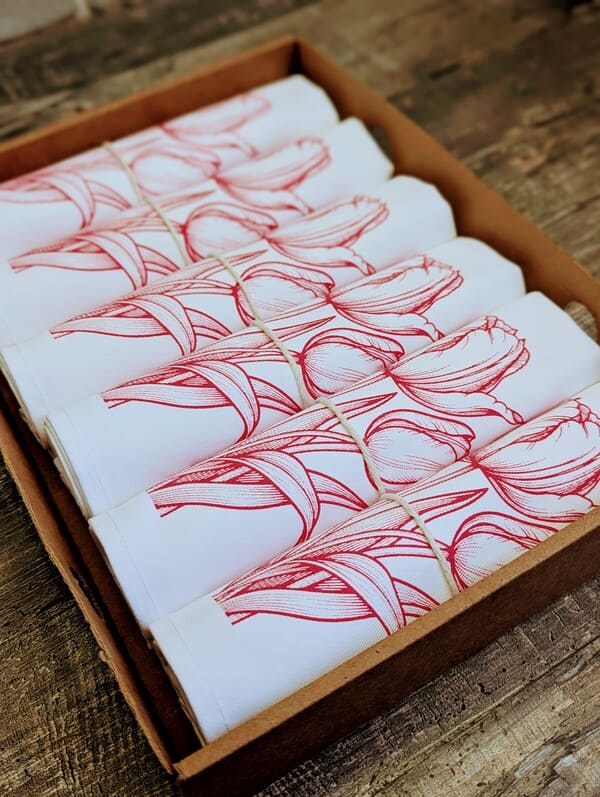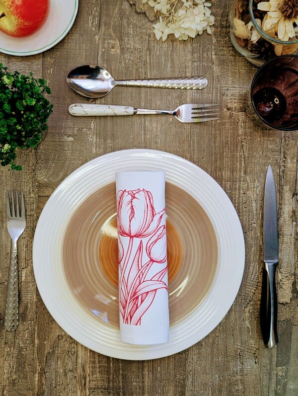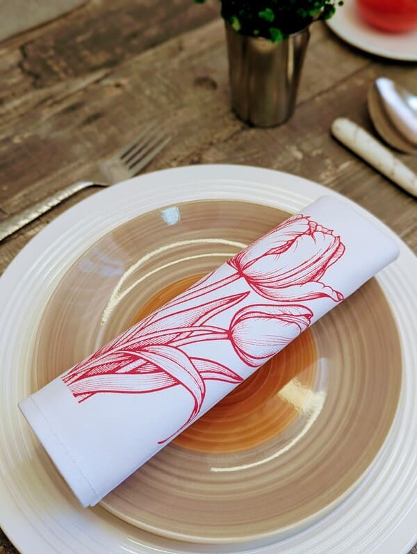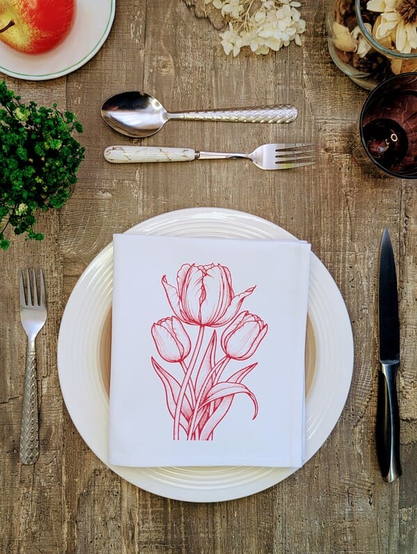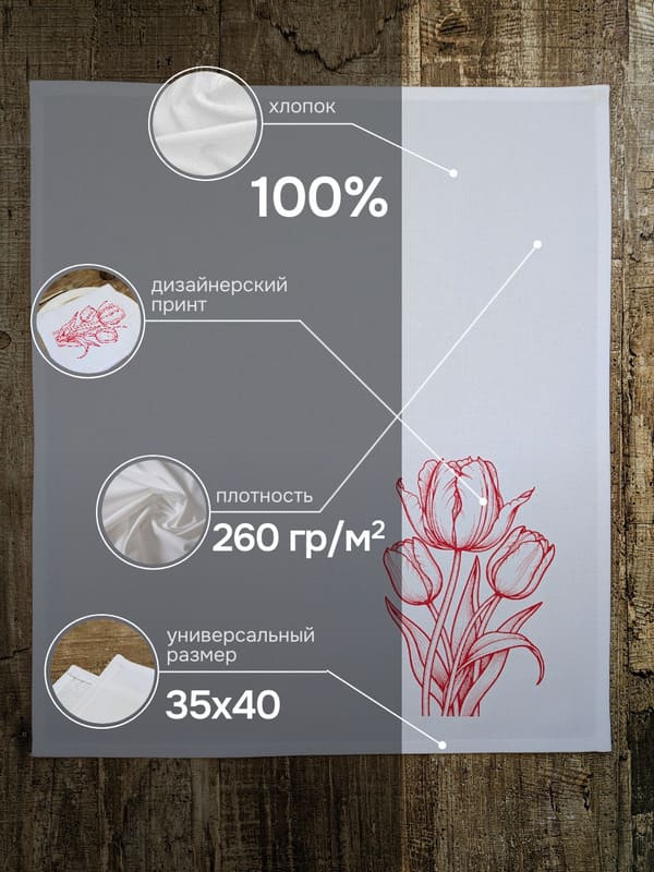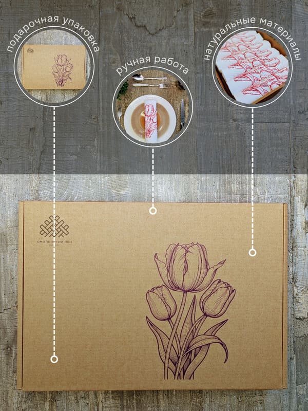 Главная драгоценность коллекции — эксклюзивный рисунок, нанесенный вручную. На безупречно белом полотне застыл изящный силуэт букета тюльпанов глубокого бордового оттенка. Этот цвет выбран не случайно: он символизирует утонченность, глубину чувств и теплую роскошь. Монохромный рисунок выглядит современно и лаконично, он не кричит, а ведет тихий диалог с гостем. Ручная работа наделяет каждый предмет душой — легкие, едва уловимые неровности мазка лишь подчеркивают ценность ремесла. Это уже не просто тканевые салфетки, а камерные произведения, наполняющие пространство художественным смыслом. Если вы ищете, где салфетки хлопковые купить с такой уникальной эстетикой, то этот набор станет редкой находкой.