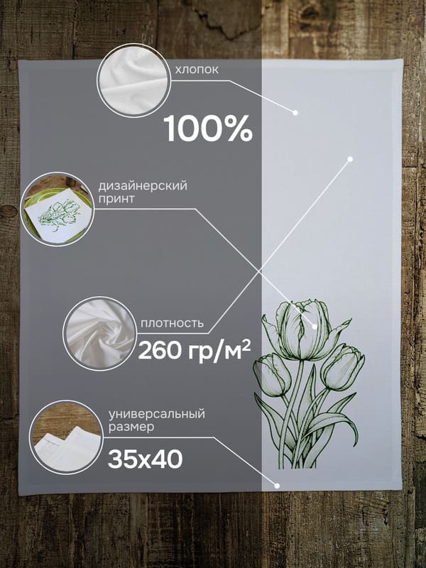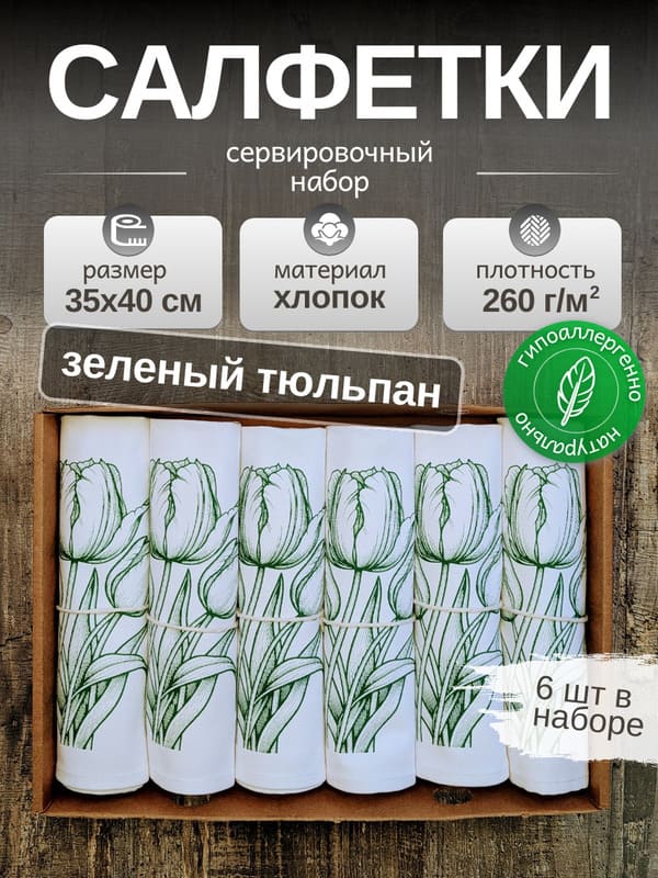 Каждая из шести салфеток размером 35×40 см создана мастерами, которые вложили в нее не только профессиональные навыки, но и частичку своей души. Ручная роспись тюльпанов в оттенках изумруда — это не шаблонный принт, а уникальная композиция, где каждый цветок словно дышит. Зеленый тюльпан, редко встречающийся в природе, символизирует гармонию, рост и обновление. Такой выбор рисунка не случаен: он подчеркивает, что истинная красота — в естественности и смелости быть необычным. Плотность хлопка 260 гр/м² гарантирует, что салфетки не деформируются даже после множества стирок, сохраняя форму и яркость рисунка. Они одинаково уместны как на праздничном столе, так и в повседневном использовании, добавляя изысканности даже скромному завтраку.