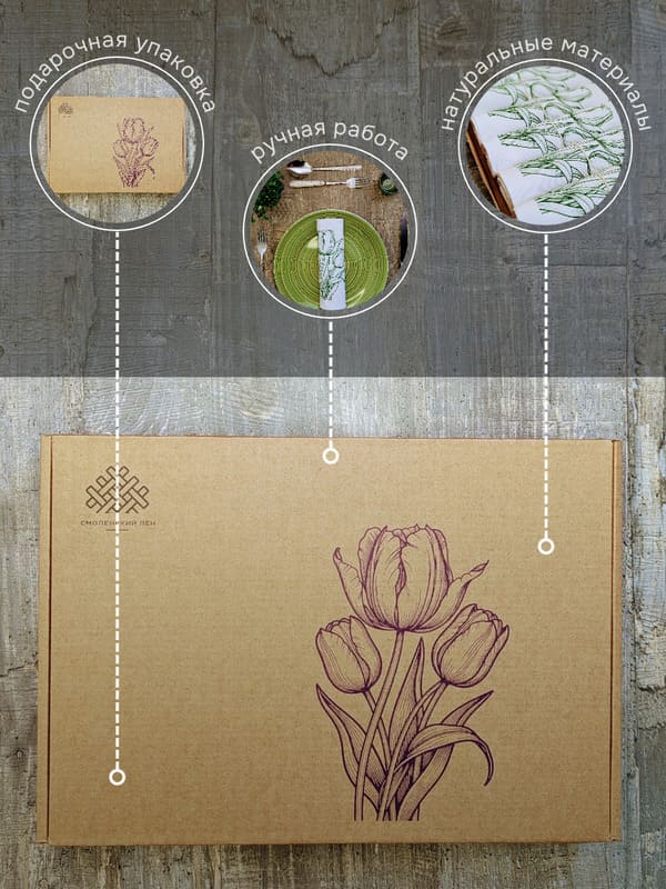 - 8 марта / Международный женский день: Подарите маме или коллеге набор, дополнив его веточкой гортензии. Салфетки с тюльпанами подчеркнут тему женской силы и нежности одновременно.