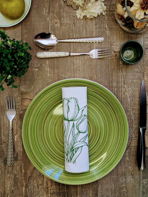 Эти сервировочные салфетки идеально подходят для создания весеннего или романтического стиля. Их зеленый тон букета гармонирует с белой, кремовой или пастельной посудой, создавая ощущение свежести и легкости. Используйте их как салфетки на стол под тарелки — они станут основой для композиции, аккуратно обрамляя блюда. Для официального ужина сложите их в виде веера или банта в центре тарелки, чтобы подчеркнуть внимание к гостям. В повседневной сервировке они добавят уюта, превратив обычный обед в маленький ритуал заботы о себе. Особенно эффектно смотрятся с прозрачной посудой или деревянными подставками, которые усиливают натуральность хлопковых салфеток.