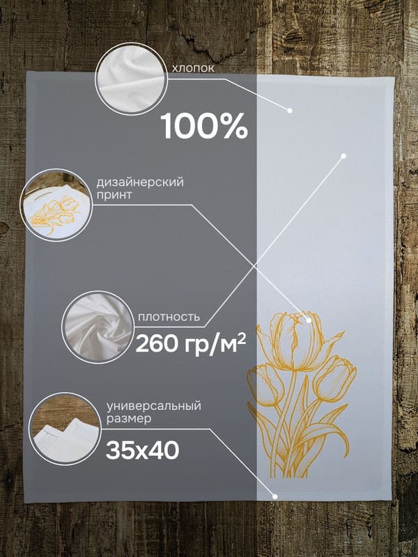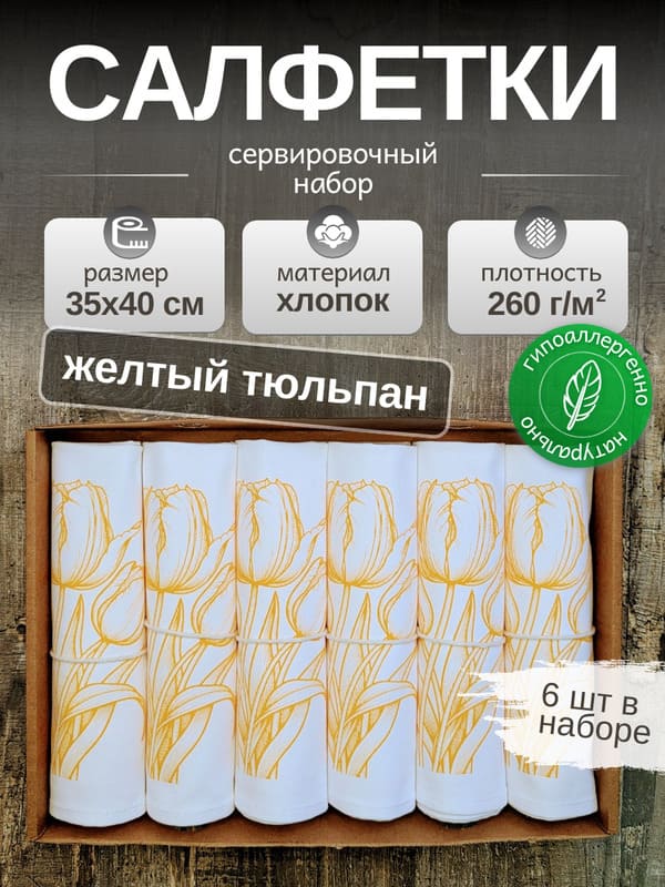 «Солнечный букет» — набор хлопковых салфеток, в котором живёт веснаСервировка стола — это не просто расстановка посуды, а способ выразить заботу, уважение и внимание к деталям. И ничто не передаёт эту тонкую грамоту так, как натуральные тканевые салфетки. Особенно если они сделаны вручную из 100% отбеленного хлопка плотностью 260 г/м² и украшены авторским рисунком. Набор «Солнечный букет» — это шесть сервировочных салфеток, каждая из которых несёт на себе однотонный желтый букет тюльпанов. Цвет, который ассоциируется с весной, теплом, надеждой и радостью. Такие хлопковые салфетки не просто лежат на столе — они создают настроение.