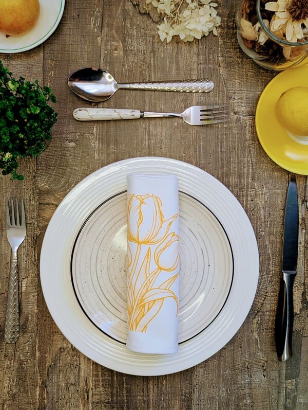 Этот формат — золотая середина между мини-салфетками для закусок и огромными скатертями. Салфетки размером 35×40 см отлично ложатся под тарелки, не свисают слишком низко, но при этом достаточно велики, чтобы использовать их как полноценные салфетки на стол под тарелки. Они не «теряются» на большом обеденном столе, но и не выглядят громоздко на маленьком кофейном. Такие красивые салфетки можно сложить конвертиком, веером или просто аккуратно разложить — в любом случае они добавят элегантности.