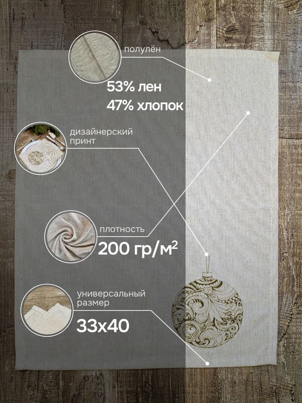 Каждая из салфеток на стол в этом наборе — это маленькое произведение искусства. Они сотканы из натуральной ткани (53% лён, 47% хлопок), которая дарит приятные тактильные ощущения и обладает превосходной прочностью. Плотность 200 гр/м² гарантирует, что эти красивые салфетки на стол не только эффектно выглядят, но и практичны в использовании: они прекрасно держат форму, не скользят и стойко переносят стирки, долго сохраняя свой безупречный вид. Использовать их как салфетки на стол под тарелки — сплошное удовольствие, ведь они создают идеальный фон для вашей праздничной посуды.