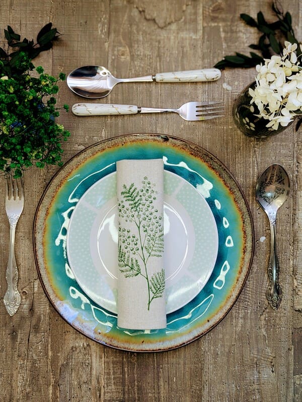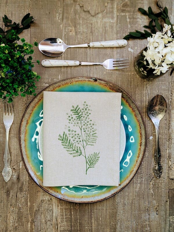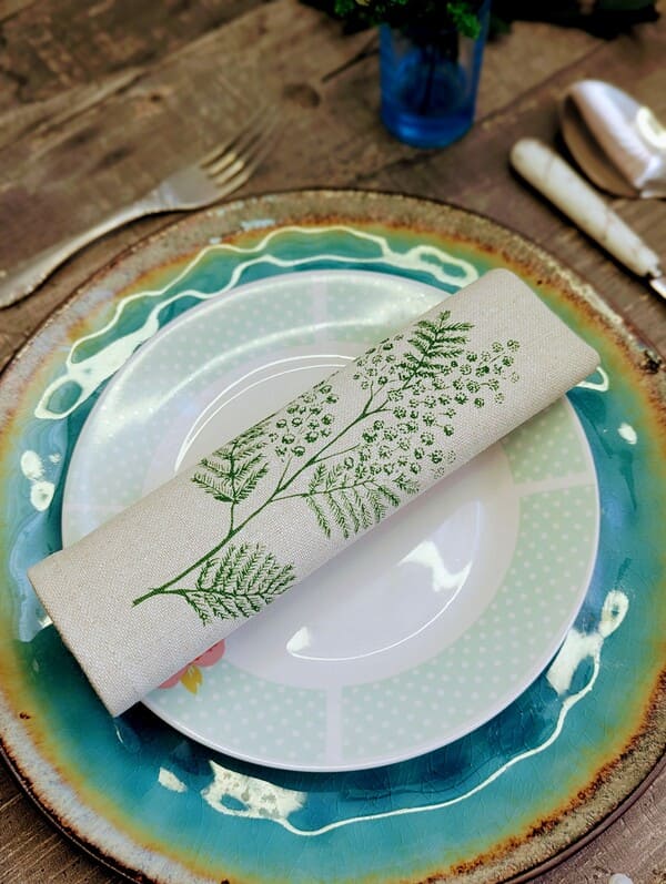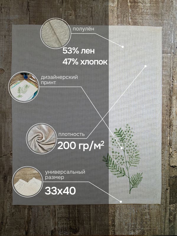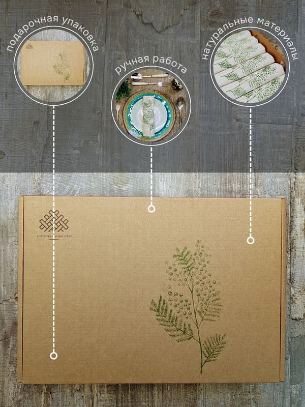Уникальность коллекции заключена в её художественном оформлении. На тепловатой, натуральной поверхности льняного полотна рукой мастера нанесен изысканный рисунок — тонкая веточка мимозы в спокойном зеленом цвете. Это нежная, графичная абстракция, отсылающая к первым весенним почкам. Выбор именно однотонного зеленого, а не традиционного желтого, делает дизайн современным, сдержанным и невероятно стильным. Такой рисунок не конфликтует с посудой, а становится её утонченным союзником, привнося на стол дыхание природы, свежести и обновления. Эксклюзивность гарантирована ручной работой: каждая веточка имеет легкие, едва уловимые различия, делая ваш набор по-настоящему единственным.