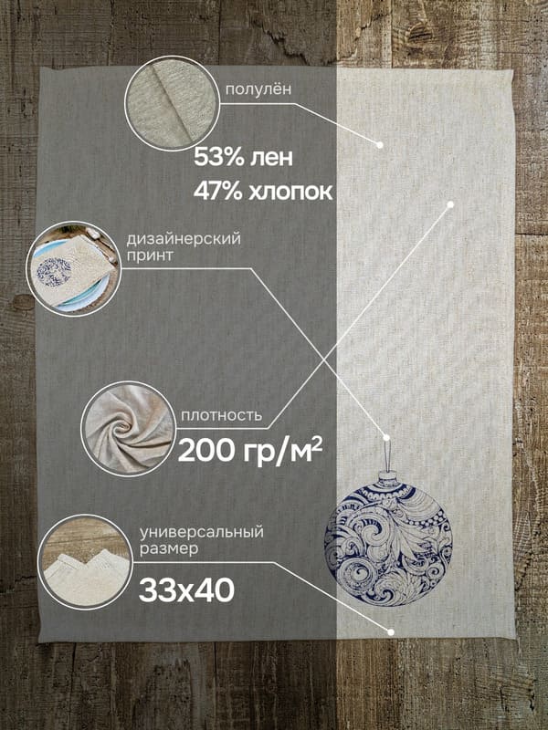 Салфетки выполнены из натуральной смеси ткани — 53% льна и 47% хлопка. Эта комбинация придаёт изделиям прочность льна и мягкость хлопка, а плотность ткани в 200 г/м² гарантирует долговечность и устойчивость к износу. При производстве продукции "Смоленский лён" используется белорусский лен (Оршанский льнокомбинат), костромской лен (Костромская льняная мануфактура), хлопок. Размер 33×40 см делает их идеальными как салфетки на стол под тарелки, так и самостоятельными элементами декора. Каждая салфетка сервировочная на стол создана вручную — это не массовое производство, а настоящее произведение тёплого, вдумчивого труда.