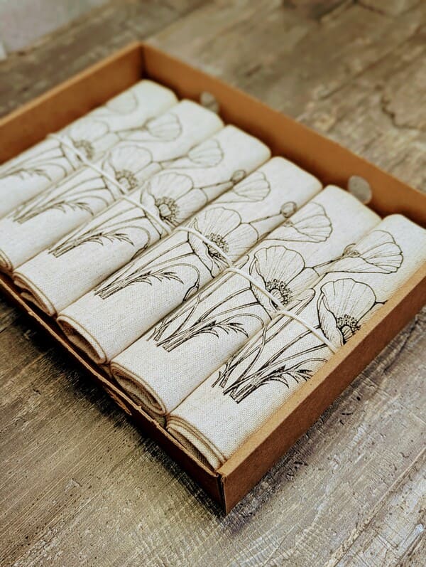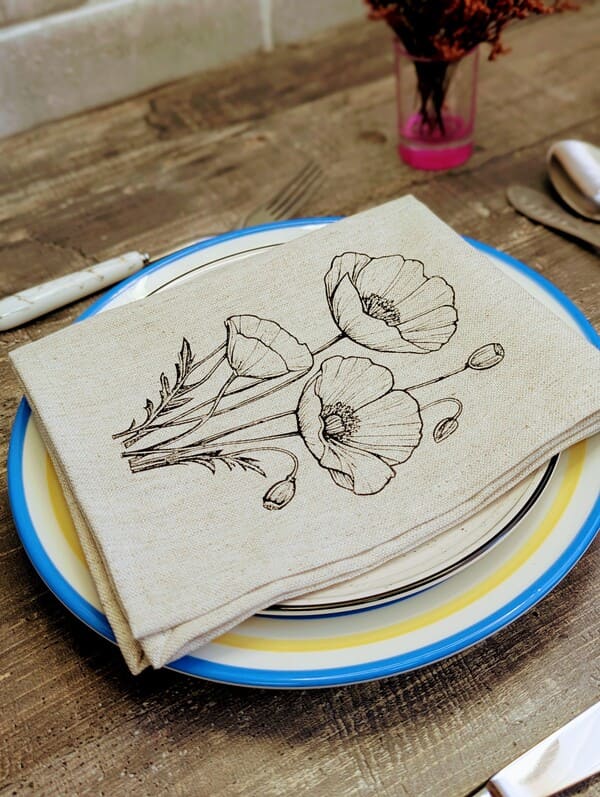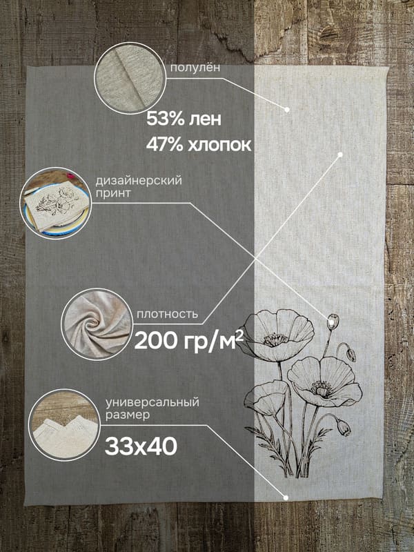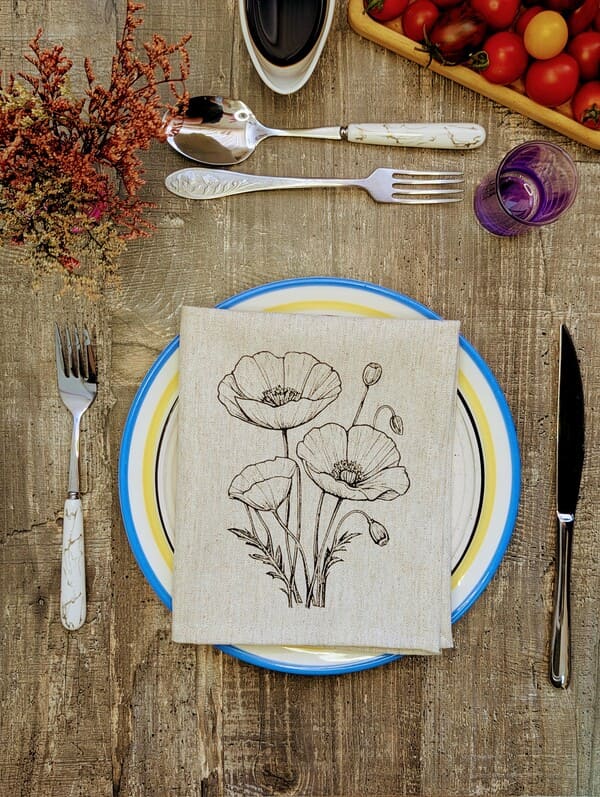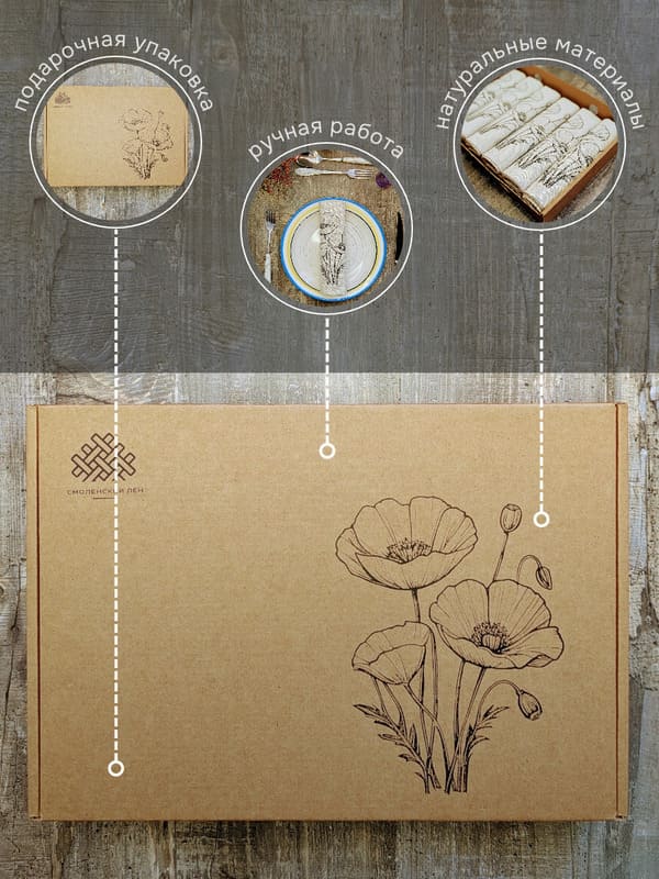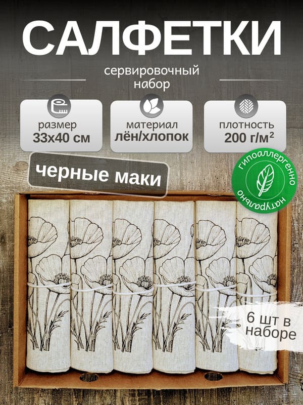 Но главная магия скрывается в дизайне. Эксклюзивный рисунок — однотонный черный цветок мака — это торжество элегантной сдержанности. Черный цвет здесь не мрачный, а глубокий и графичный. Он не кричит, а ведет изысканный диалог с посудой и интерьером. Изящный мак, отпечатанный вручную, словно парит на натуральном льняном фоне. Эта монохромная красота делает набор невероятно универсальным. Он будет одинаково гармонично смотреться на новогоднем празднике с золотым декором, на романтическом ужине при свечах, на летней веранде или на повседневном семейном завтраке. Использовать эти салфетки на стол под тарелки — значит создать законченную, продуманную композицию. Они станут идеальным фоном для белоснежной фарфоровой тарелки, оттеняя ее и делая блюдо еще более аппетитным.