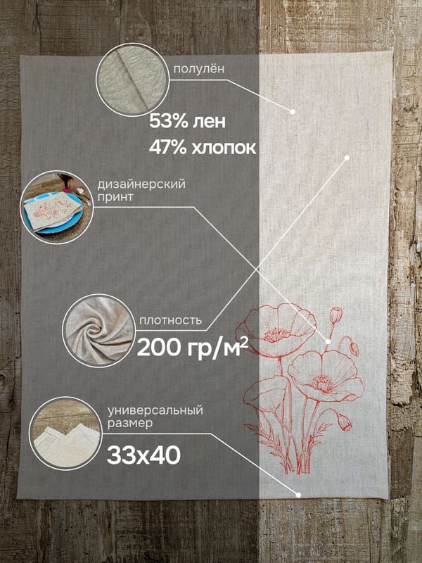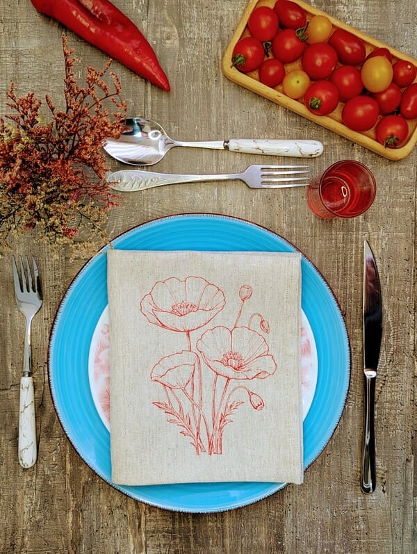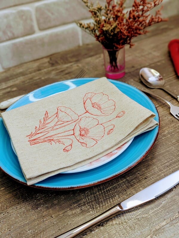 Знаешь, бывает так — заходишь в гости, а на столе всё просто, но с душой: тарелки на аккуратных салфетках, цвет мака горит, как лето, и даже чай с бабушкиными пирожками вдруг кажется торжеством. Вот для таких моментов и созданы эти красивые салфетки на стол — салфетки ручной работы, из мягкого льна с хлопком (53% и 47%), плотные, 200 гр/м² — не мнутся, не скользят, лежат как влитые.Размер 33×40 — не случайно. Это как раз то, что нужно, чтобы салфетки на стол под тарелки смотрелись достойно: не болтаются края, не теряются под посудой, а наоборот — подчёркивают её. Мак на каждой — однотонный, но будто живой: ни одного повторяющегося штриха, потому что это ручная роспись. Такие тканевые салфетки не просто украшают — они создают настроение.