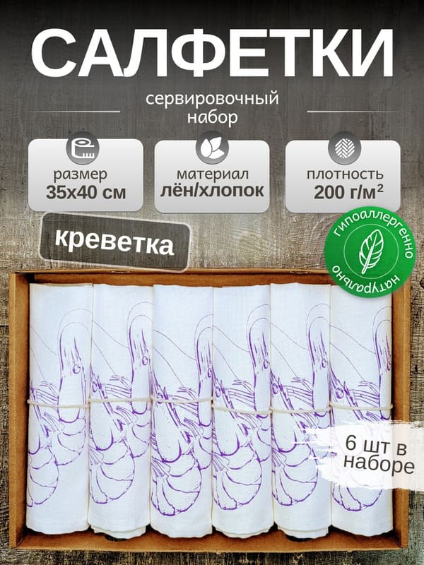 Превратите каждый прием пищи в эстетическое удовольствие с набором из шести красивых салфеток на стол, созданных для ценителей стиля и натуральных материалов. Эти льняные салфетки из отбеленного льна и хлопка (30% лён, 70% хлопок) украшены эксклюзивным рисунком однотонной креветки, который привносит в интерьер нотку морской свежести. Ручная работа, эко-краски и продуманные детали делают набор идеальным выбором как для повседневного использования, так и для особых случаев.