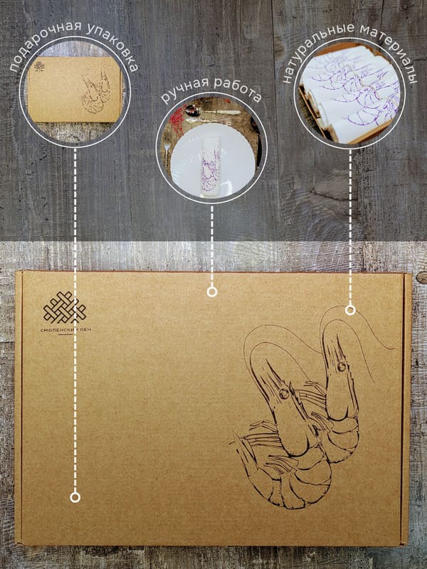 Плотность ткани 200 г/м² обеспечивает салфеткам идеальную форму: они не деформируются после стирки, сохраняя безупречный вид годами. Лён дарит фактурность и экологичность, а хлопок — мягкость и гипоаллергенность. При производстве продукции "Смоленский лён" используется белорусский лен (Оршанский льнокомбинат), костромской лен (Костромская льняная мануфактура), хлопок.